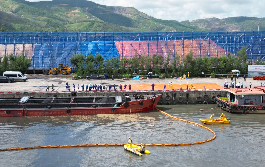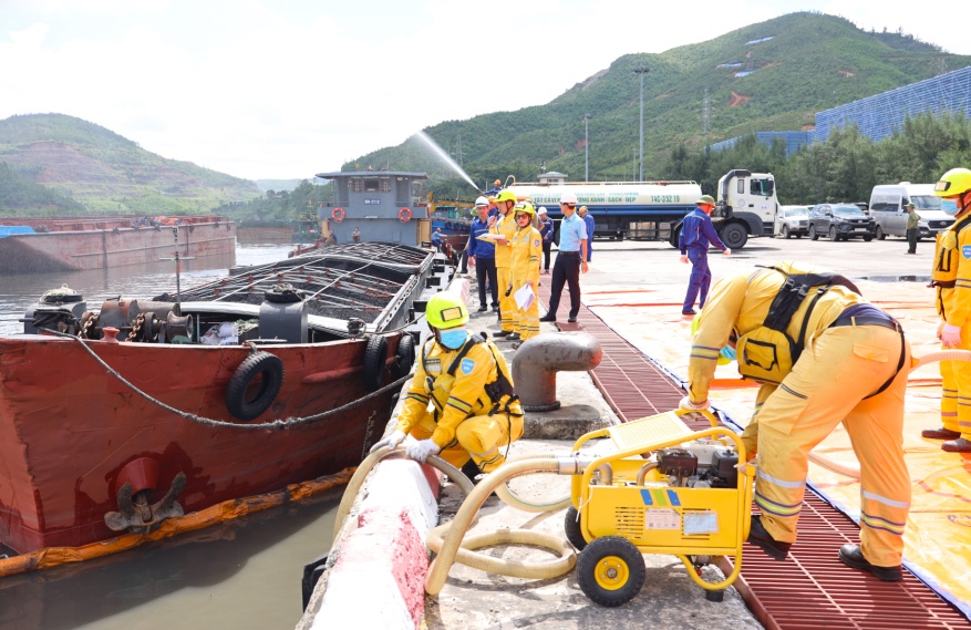 Cuộc diễn tập được triển khai trên tình huống giả định: Một tàu tự hành chở than, sau khi nhận hàng và di chuyển từ bến số 3 ra tuyến luồng sông Diễn Vọng, bất ngờ bị một xà lan chở than đâm va. Nguyên nhân là do xà lan bị đứt dây cáp kết nối với tàu lai, trôi tự do theo dòng nước. Vụ va chạm khiến khoang chứa nhiên liệu của tàu bị thủng, làm tràn khoảng 1.000 lít dầu DO ra môi trường nước; đồng thời có một thuyền viên bị vấp ngã, rơi xuống sông. Ngay khi phát hiện sự cố, thuyền trưởng đã nhanh chóng cho tắt động cơ, thả neo cố định tàu, huy động các thuyền viên cứu người bị nạn, khóa van nhiên liệu, tạm thời bịt kín vị trí rò rỉ và khẩn trương báo cáo Đội Ứng phó sự cố tràn dầu (ƯPSCTD) khu vực Cụm bến 3.