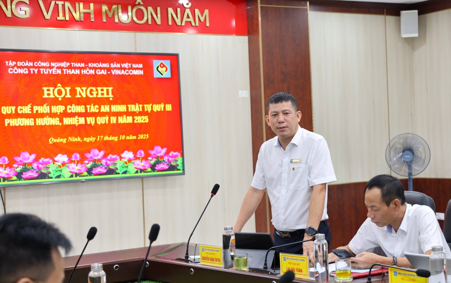 Chiều 17/10, tại trụ sở Văn phòng, Công ty Tuyển than Hòn Gai - Vinacomin tổ chức Hội nghị sơ kết Quy chế phối hợp công tác an ninh trật tự (ANTT) quý III và triển khai nhiệm vụ quý IV năm 2025. Đồng chí Nguyễn Xuân Tuyên - Phó Giám đốc phụ trách công tác an ninh trật tự của Công ty chủ trì hội nghị.
