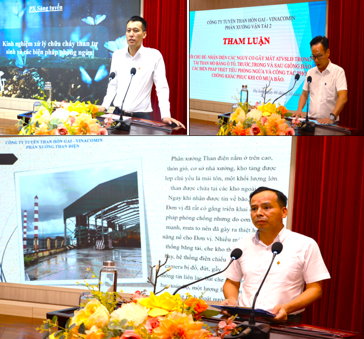 Hội nghị cũng đã nghe ý kiến tham luận của đại diện các phân xưởng: Vận tải 2, Than điện và Sàng tuyển về công tác nhận diện các nguy cơ gây mất an toàn, biện pháp triệt tiêu phòng ngừa; bài học kinh nghiệm trong ứng phó và khắc phục hậu quả bão số 3; giải pháp phòng ngừa than nhập khẩu tự cháy.