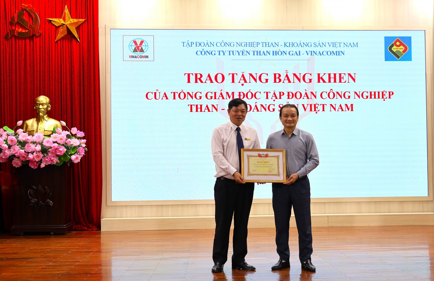 Đồng chí Trần Danh Nghị - Ủy viên ban Thường vụ, Trưởng ban tuyên giáo Đảng ủy TKV trao bằng khen của Tổng giám đốc cho Công ty
