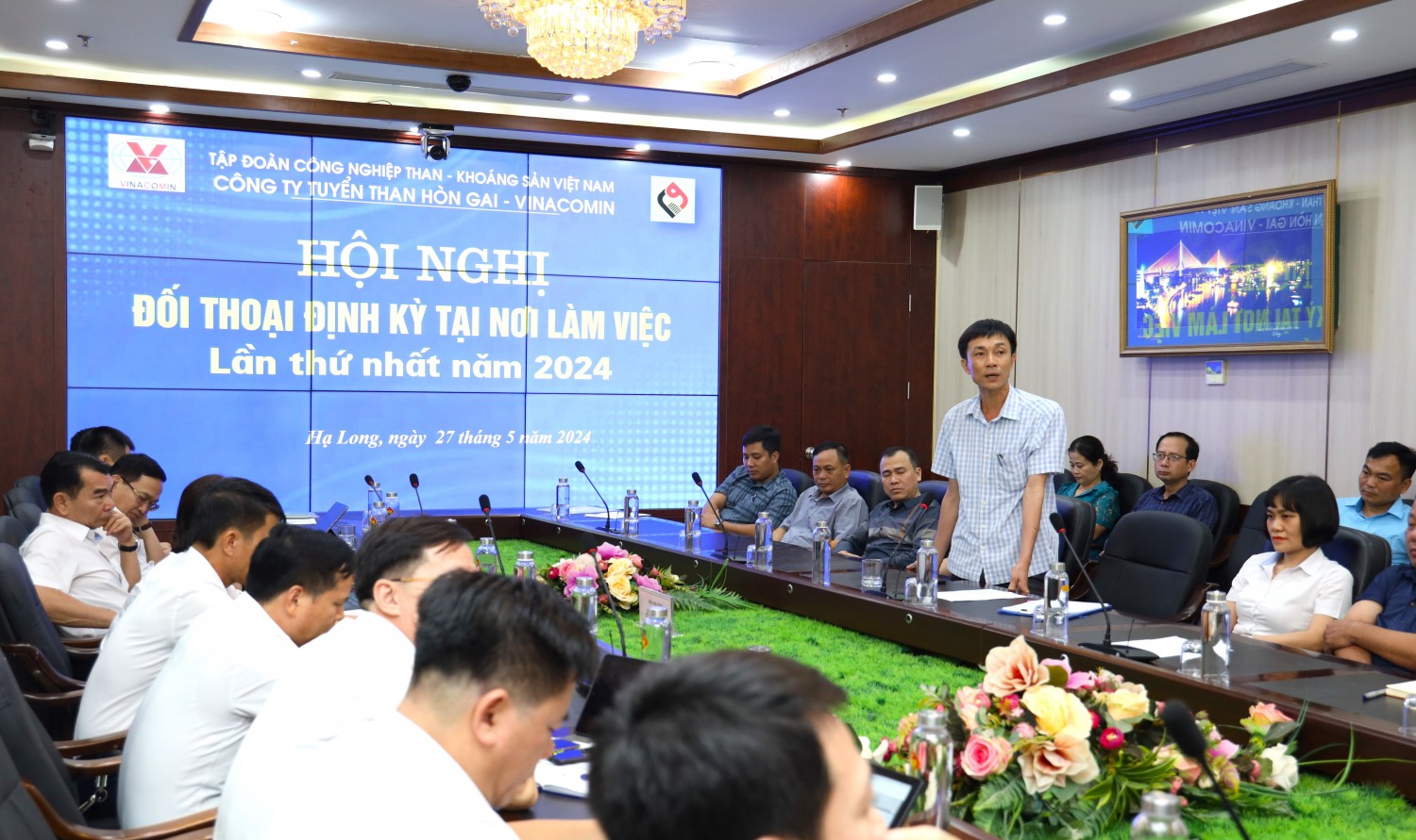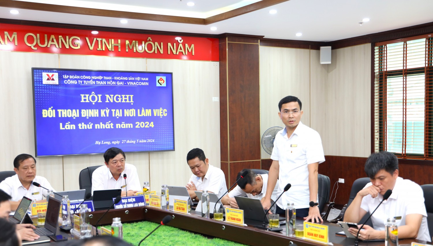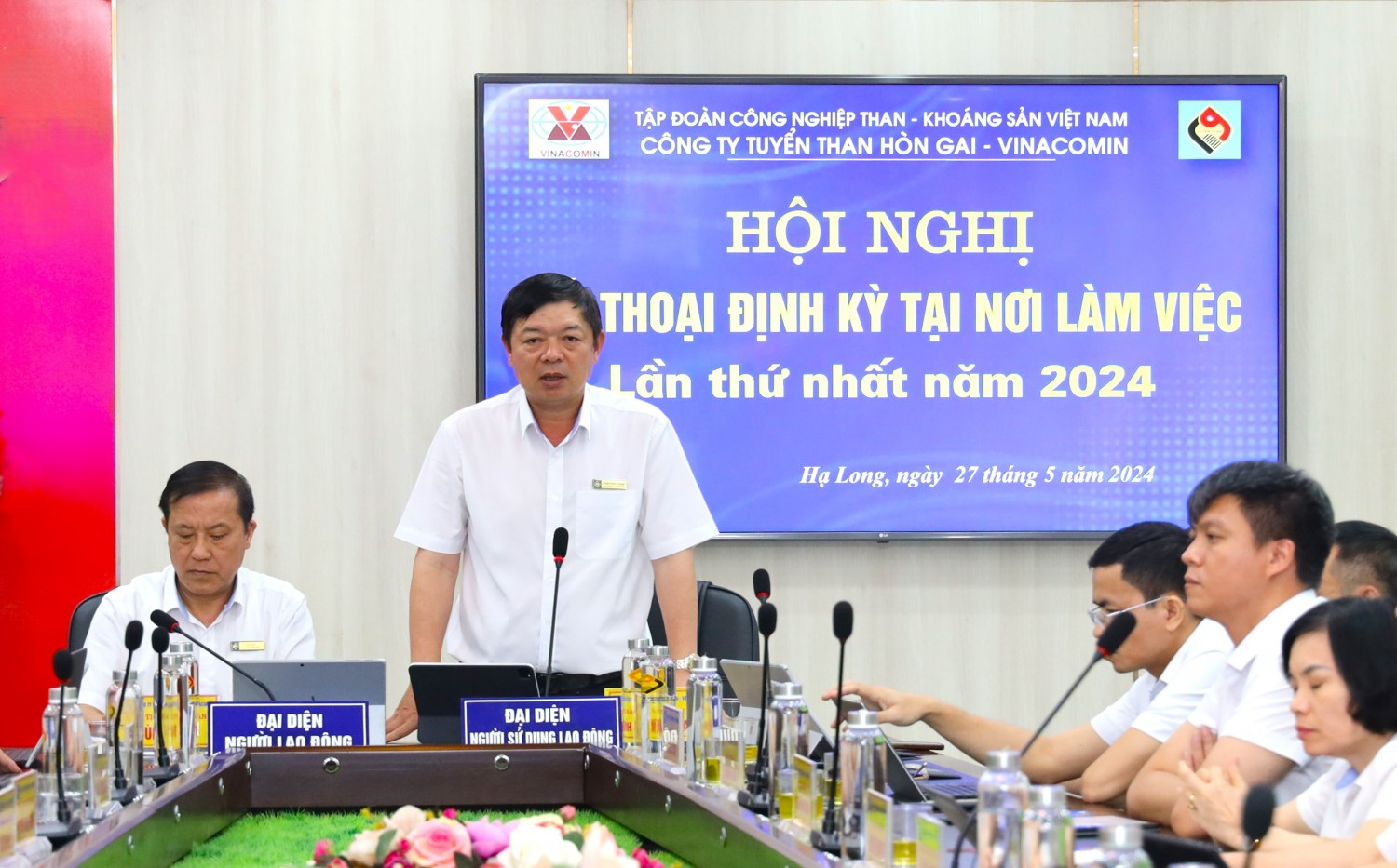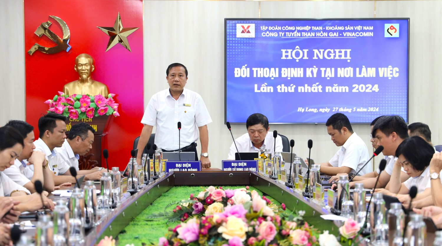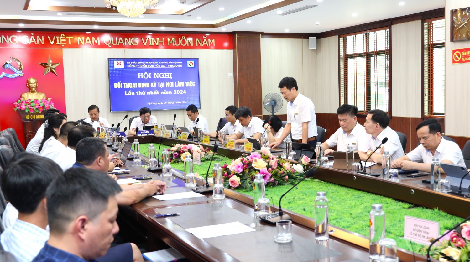 Chiều ngày 27/5, tại phòng họp tầng 6 Văn phòng. Công ty Tuyển than Hòn Gai - Vinacomin tổ chức Hội nghị đối thoại định kỳ lần thứ nhất năm 2024 giữa Người lao động và Người sử dụng lao động. Đồng chí Phạm Hồng Thanh - Bí thư Đảng ủy, Giám đốc Công ty; đồng chí Bùi Hữu Lý - Chủ tịch Công đoàn Công ty đồng chủ trì Hội nghị.