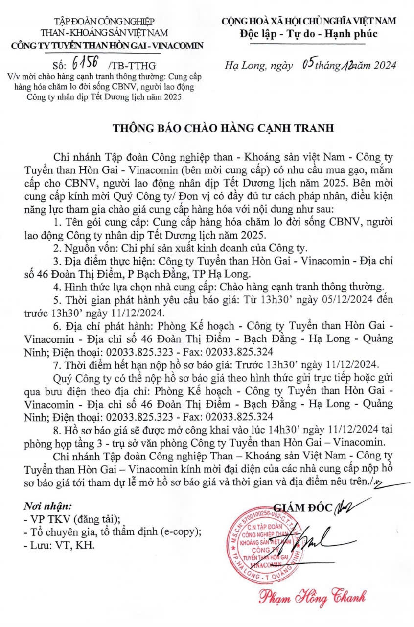 Thông báo mời chào hàng cạnh tranh thông thường: Cung cấp hàng hóa chăm lo đời sống CBNV, người lao động Công ty nhân dịp Tết Dương lịch năm 2025