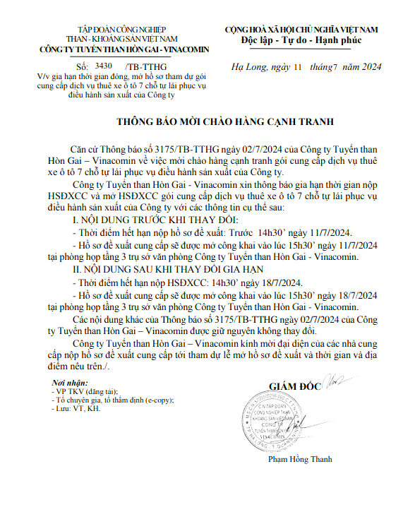Thông báo về việc gia hạn thời gian đóng, mở hồ sơ tham dự gói: Cung cấp dịch vụ thuê xe ô tô 7 chỗ tự lái phục vụ điều hành sản xuất của Công ty