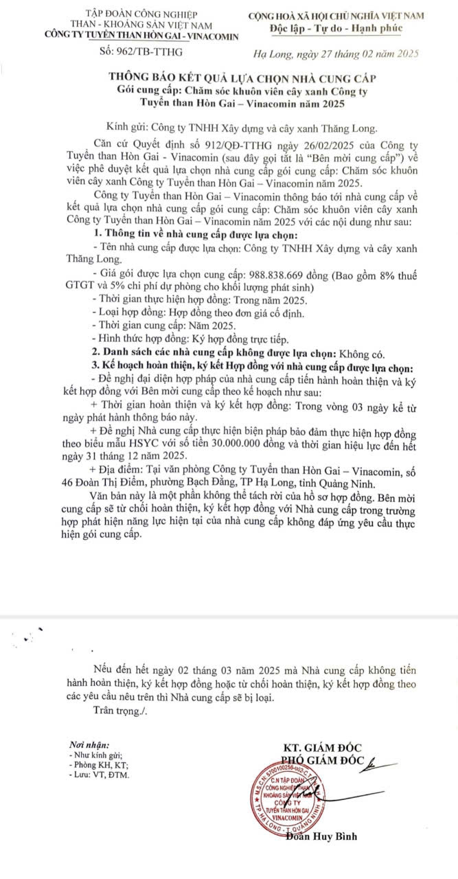 Thông báo kết quả lựa chọn nhà cung cấp gói chăm sóc khuôn viên cây xanh Công ty Tuyển than Hoàn Gai - Vinacomin năm 2025
