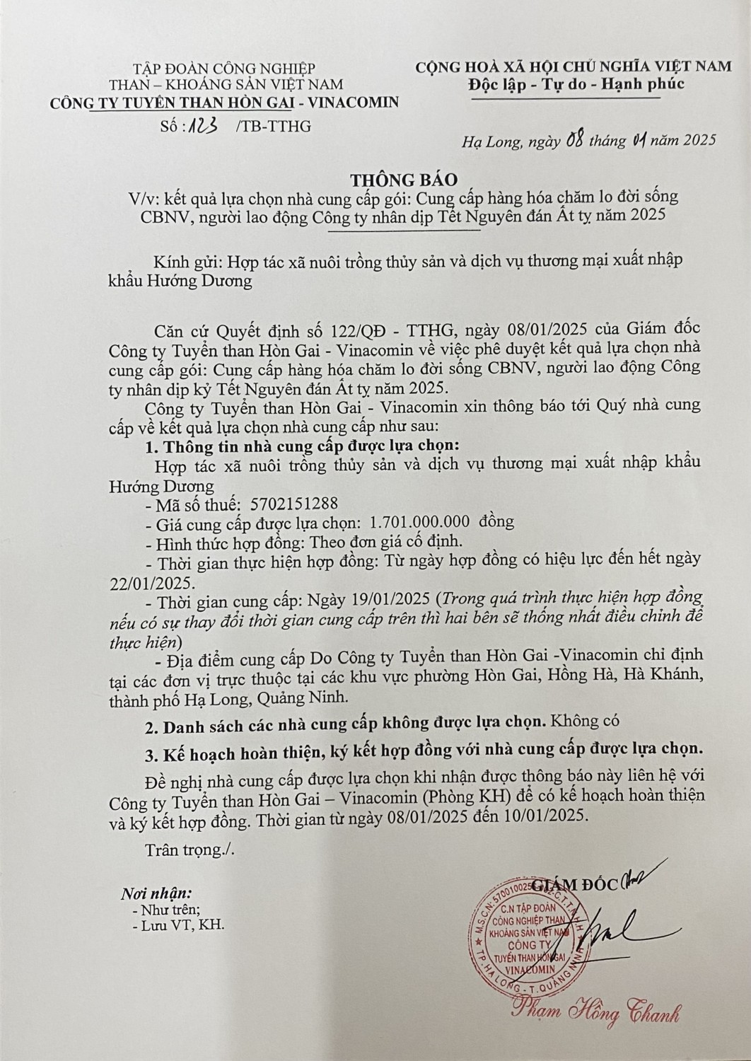 Thông báo kết quả lựa chọn nhà cung cấp gói: Cung cấp hàng hóa chăm lo đời sống CBNV, người lao động Công ty nhân dịp Tết Nguyên đán Ất Tỵ năm 2025