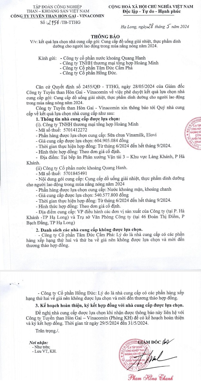 Thông báo: Kết quả lựa chọn nhà cung cấp gói đồ uống giải nhiệt, thực phẩm dinh dưỡng cho người lao động trong mùa nắng nóng năm 2024