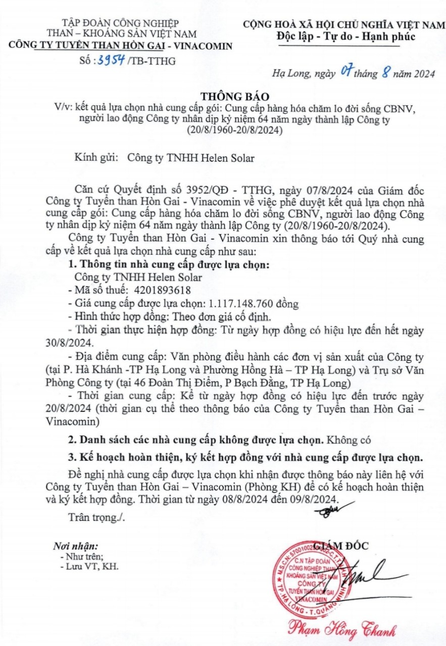 Thông báo: Kết quả lựa chọn nhà cung cấp gói hàng hóa chăm lo đời sống CBCNV, người lao động Công ty nhân dịp kỷ niệm 64 năm ngày thành lập Công ty (20/8/1960-20/8/2024)