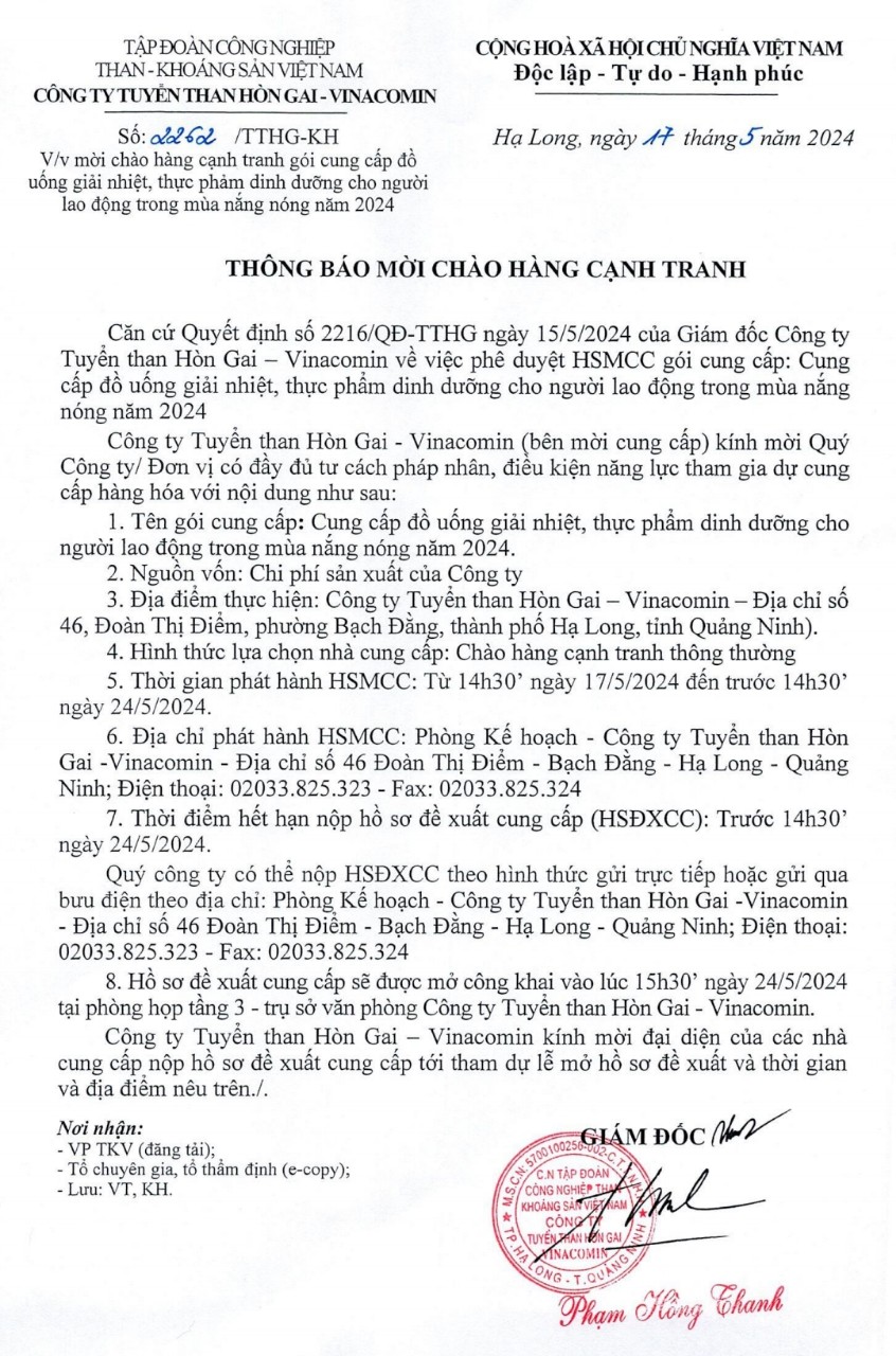 Thông báo mời chào hàng cạnh tranh gói: Cung cấp đồ uống, giải nhiệt, thực phẩm dinh dưỡng cho người lao động trong mùa nắng nóng năm 2024