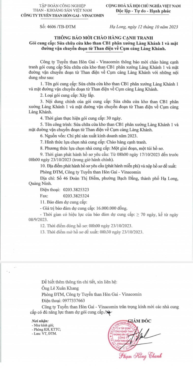 Thông báo mời chào hàng cạnh tranh gói cung cấp: “Sửa chữa cửa kho than CB1 Phân xưởng Làng khánh 1 và mặt đường vận chuyển đoạn từ Than điện về cụm Cảng làng khánh