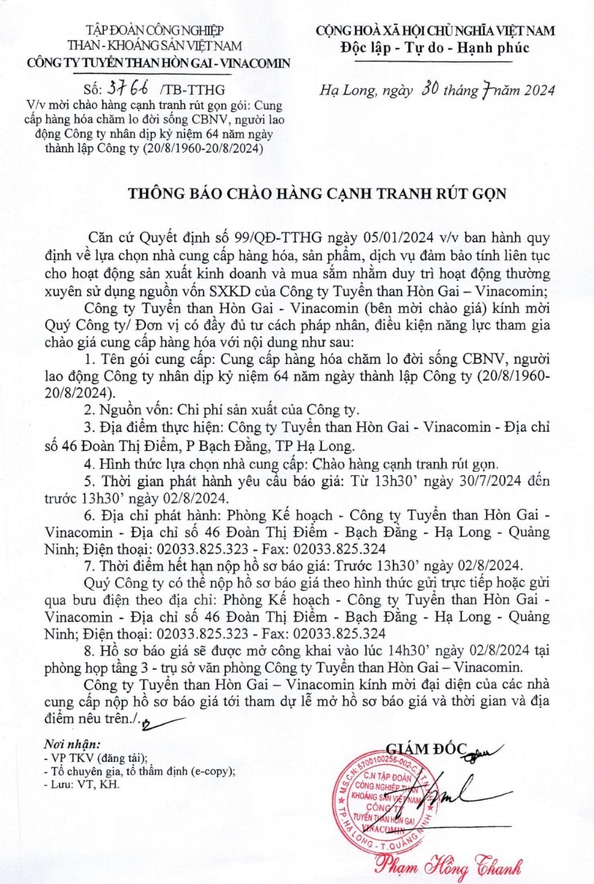 Thông báo mời chào hàng cạnh tranh rút gọn gói: Cung cấp hàng hóa chăm lo đời sống CBNV, người lao động nhân dịp kỷ niệm 64 năm ngày thành lập Công ty (20/8/1960 - 20/8/2024)