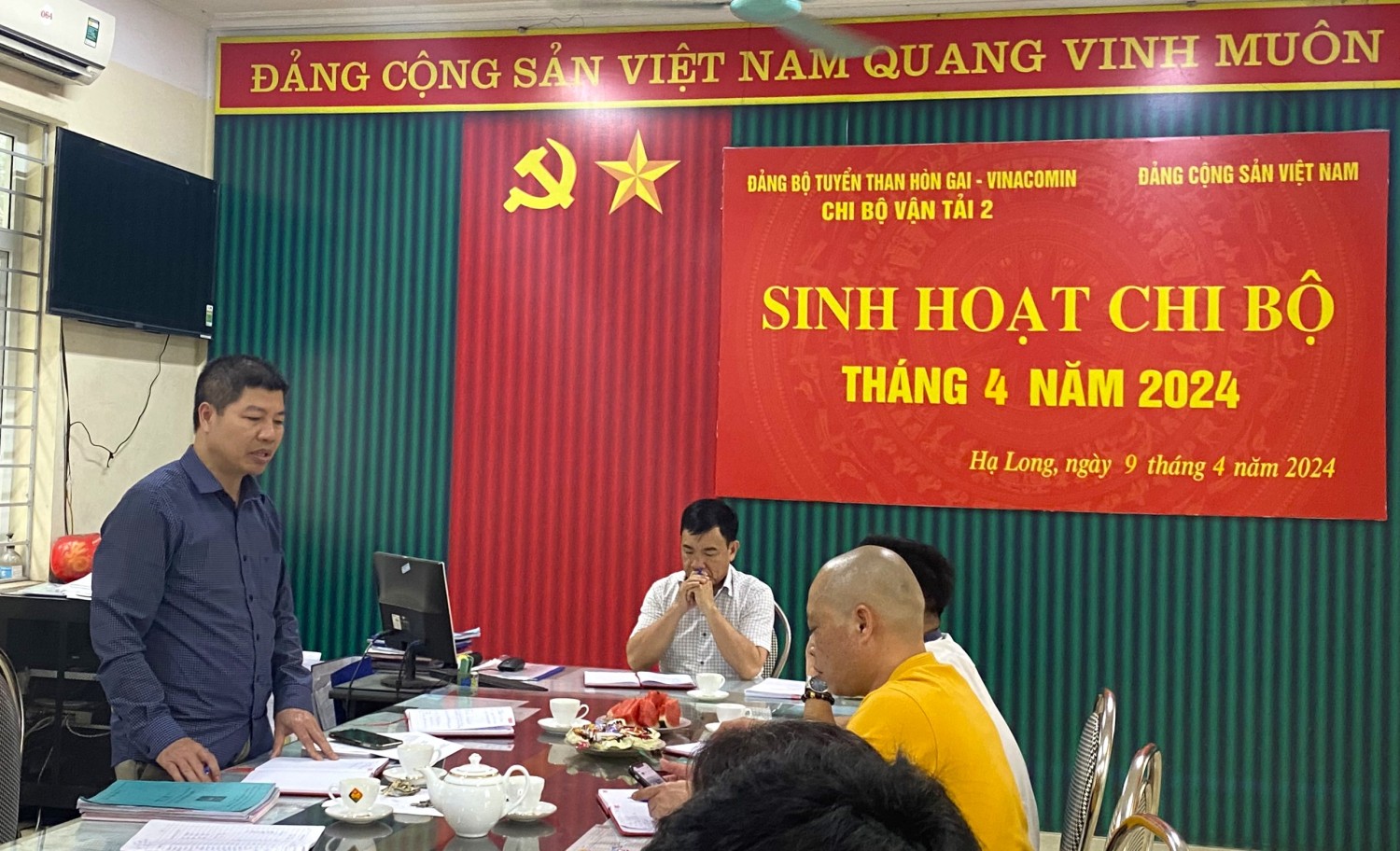 Triển khai các nhiệm vụ quý II/2024, đồng chí Bí thư chi bộ đề nghị tất cả CB, đảng viên trong đơn vị cần nỗ lực cố gắng hơn nữa; cán bộ trực ca cần bố trí lao động làm việc hợp lý để đảm bảo an toàn, sản xuất hiệu quả, phấn đấu hoàn thành vượt mức kế hoạch SXKD hàng tháng được Công ty giao; bộ phân kỹ thuật cần chú trọng công tác kiểm tu, bảo dưỡng thiết bị đầy đủ theo kế hoạch số 1353/KH-TTHG ngày 01/4/2024 của Giám đốc Công ty; các tổ chức đoàn thể tuyên truyền cho CBCNV thực hiện tốt công tác AT-VSLĐ, đảm bảo ANTT, VSMT, quyết liệt thực hiện các biện pháp ngăn chặn các nguy cơ mất an toàn trong sản xuất và yêu cầu các lái xe thực hiện nghiêm túc 100% có bạt che than khi ra vận chuyển than, đảm bảo môi trường “Sáng - Xanh - Sạch”.
