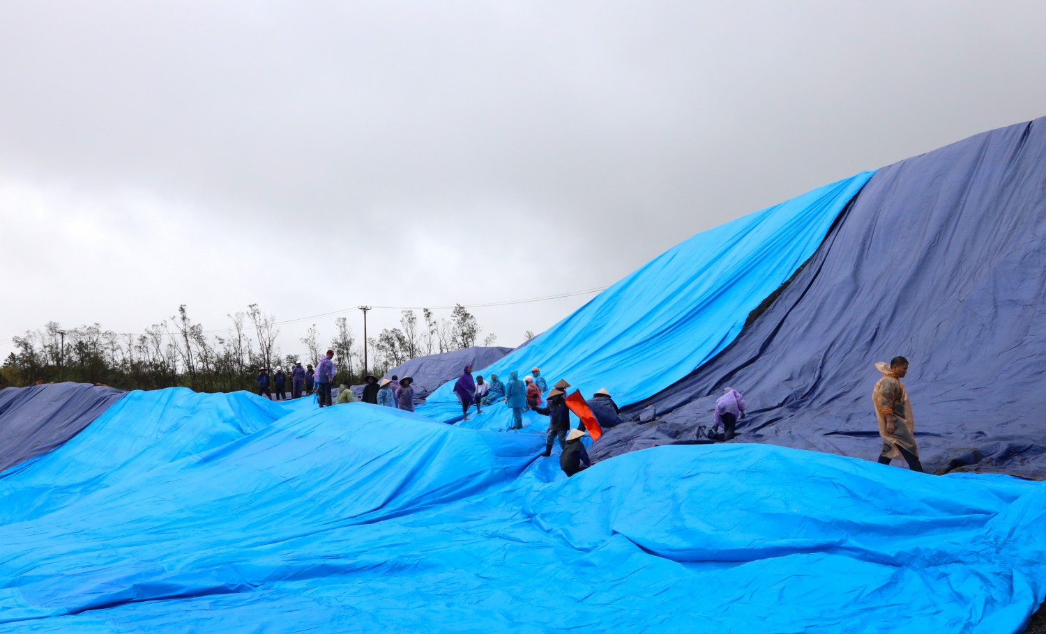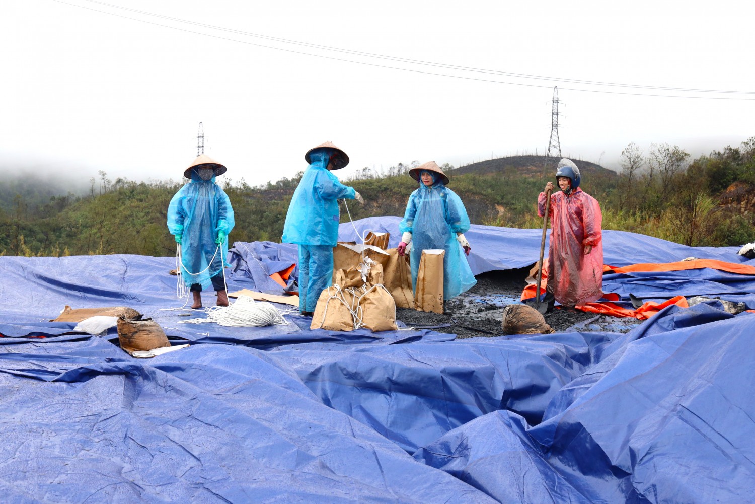 Hình ảnh CBCNV đang tập trung che bạt các kho than trước mưa bão.
