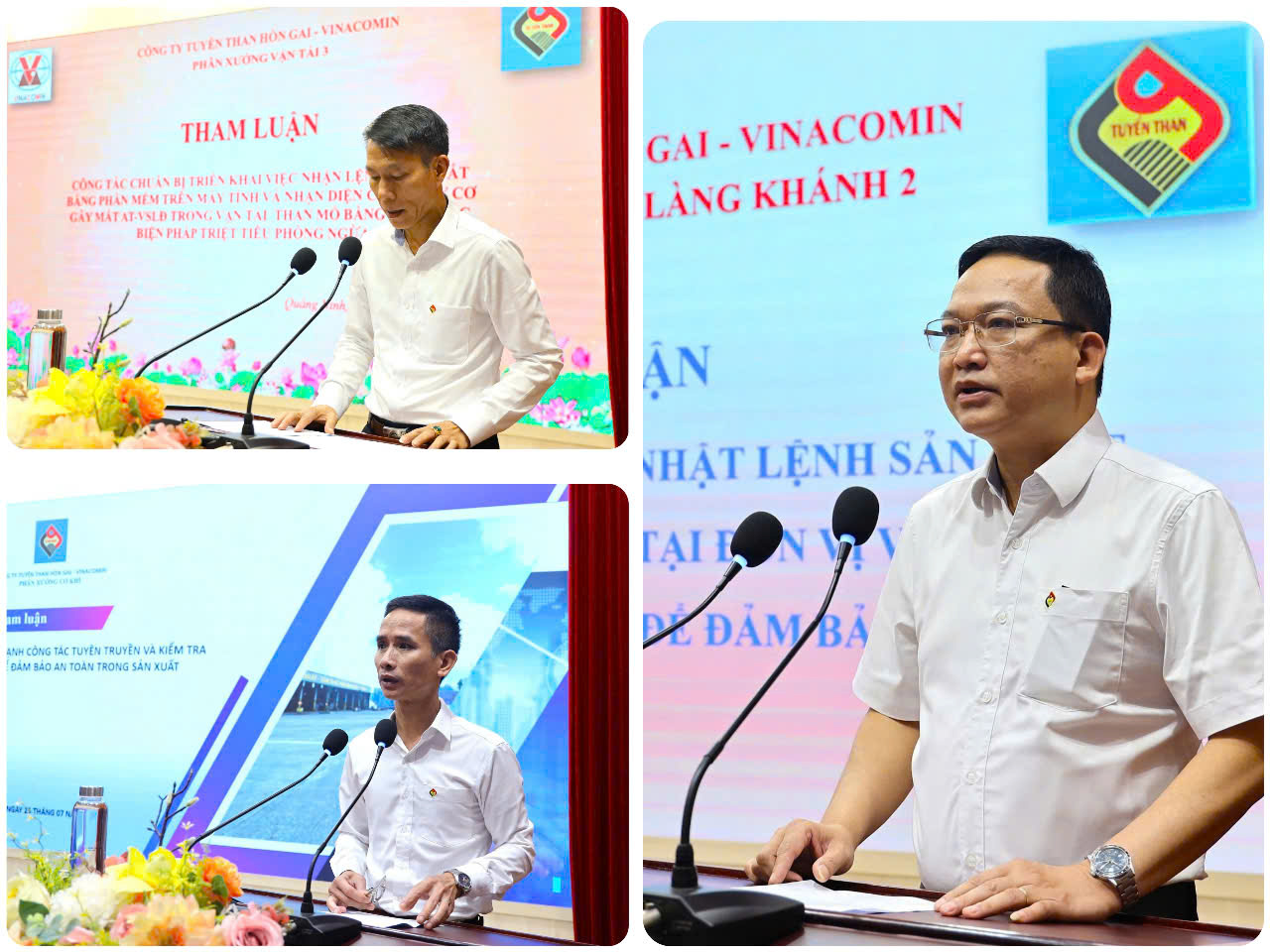 Hội nghị đã nghe 3 ý kiến tham luận tiêu biểu đến từ Phân xưởng Làng Khánh 2, Phân xưởng Cơ khí và Phân xưởng Vận tải 3 về các giải pháp thiết thực trong tổ chức kiểm soát an toàn thiết bị, kiểm tra kỹ thuật trong mùa mưa bão và nâng cao vai trò của người lao động trong nhận diện nguy cơ rủi ro. Đây là những bài học quý báu cần được lan tỏa rộng rãi trong toàn Công ty.