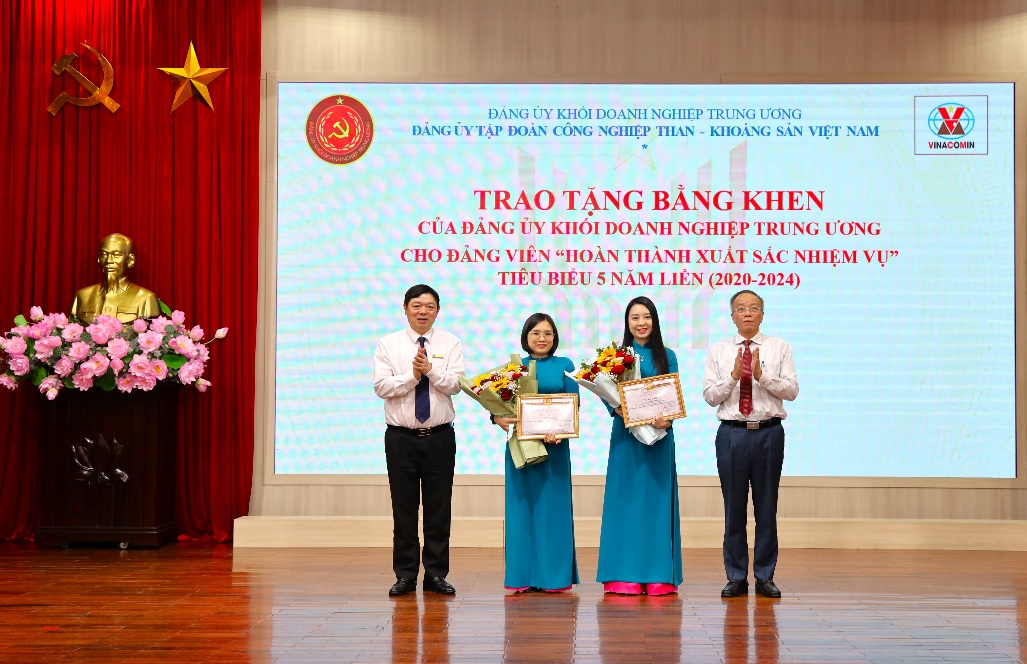 Ảnh: Lãnh đạo Đảng ủy TKV và Bí thư Đảng ủy Công ty trao tặng bằng khen của Đảng ủy khối Doanh nghiệp TW cho 2 đảng viên hoàn thành xuất sắc nhiệm vụ 5 năm (2020-2024).