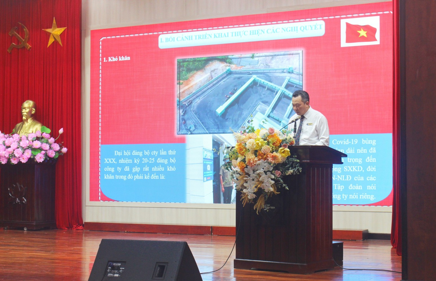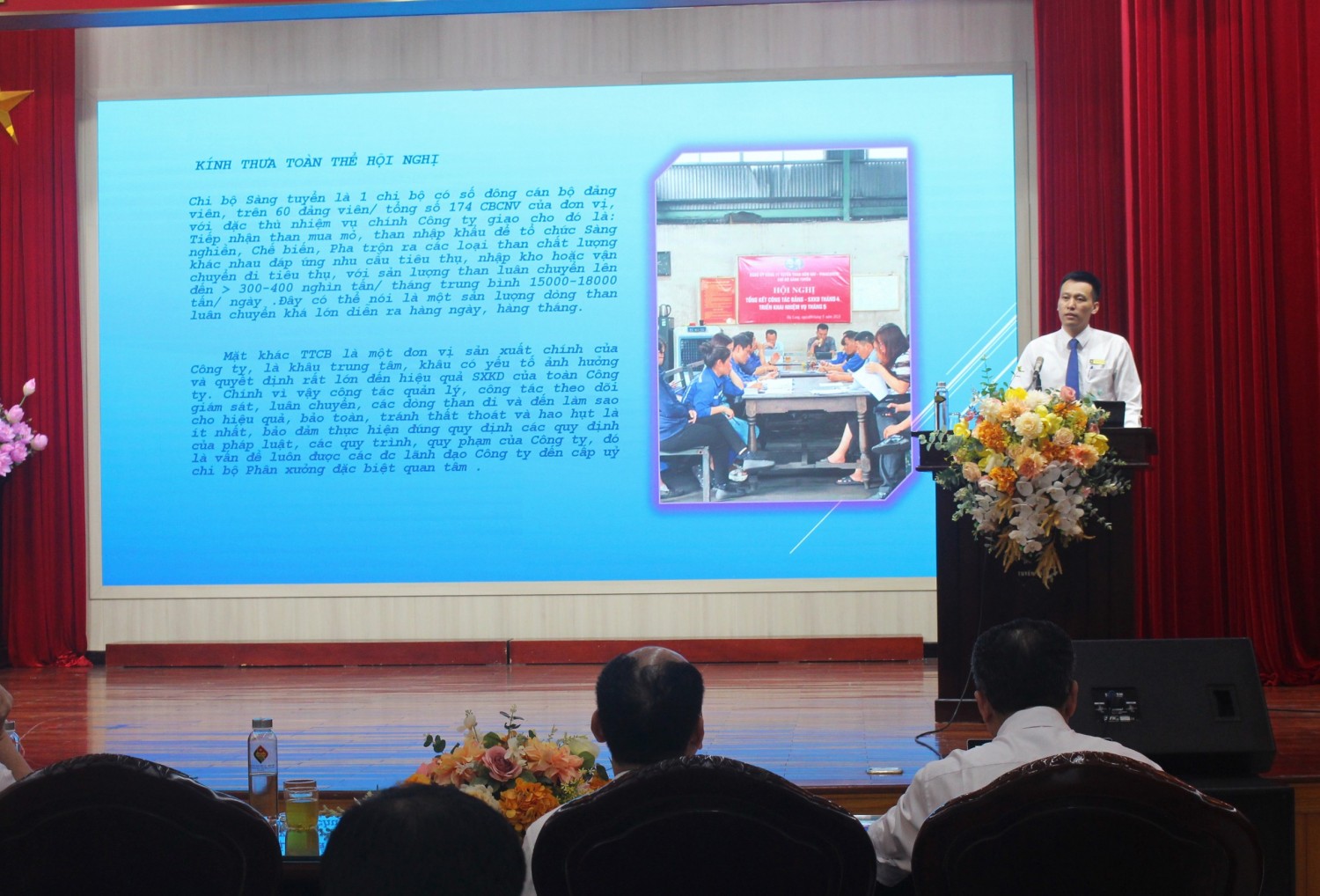 Hội nghị đã nghe đồng chí Trương Quốc Chiến - Phó bí thư thường trực Đảng ủy báo cáo đánh giá giữa nhiệm kỳ thực hiện Nghị quyết Đại hội Đảng bộ TKV lần thứ III và Nghị quyết Đại hội Đảng bộ Công ty khóa XXX nhiệm kỳ 2020-2025.