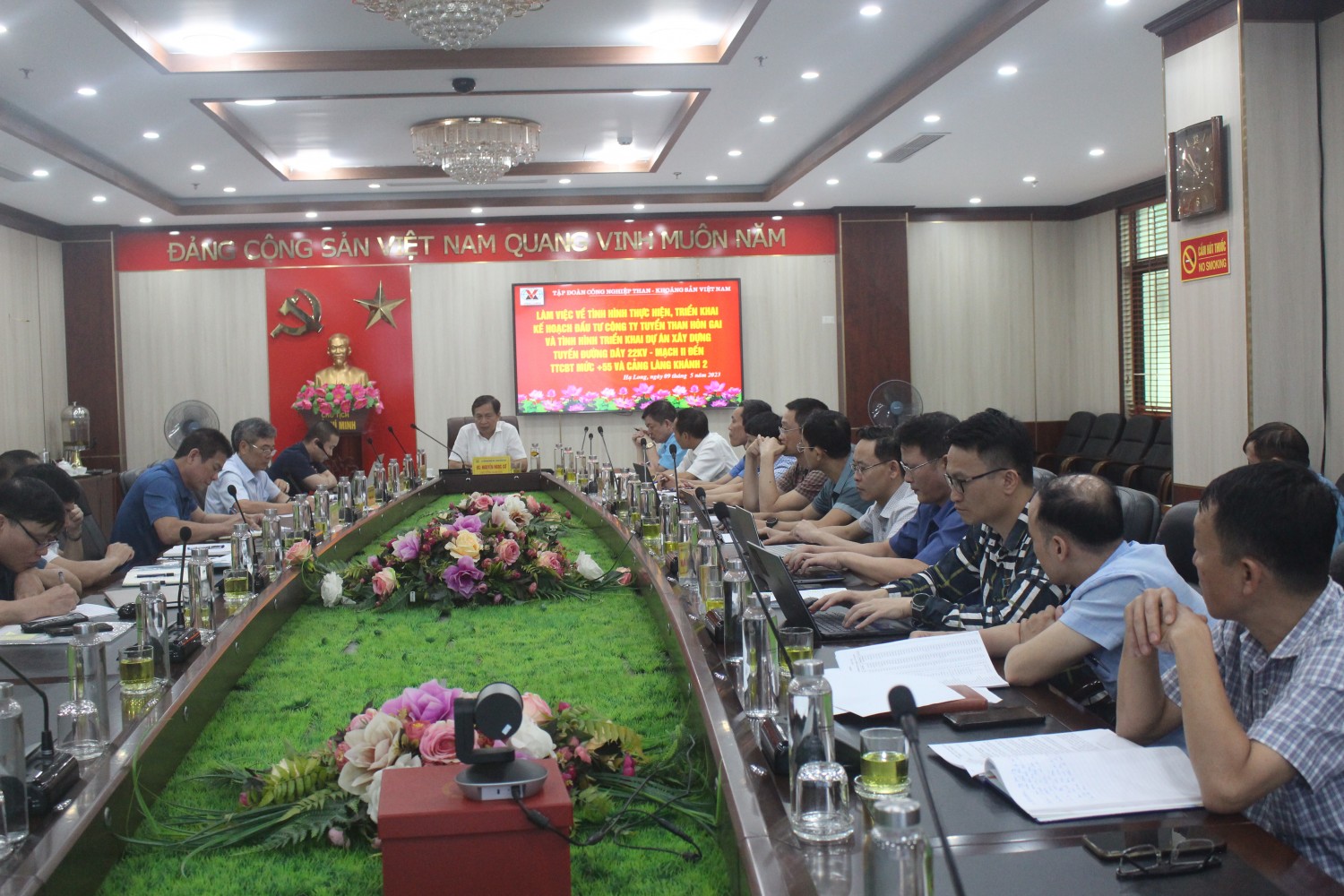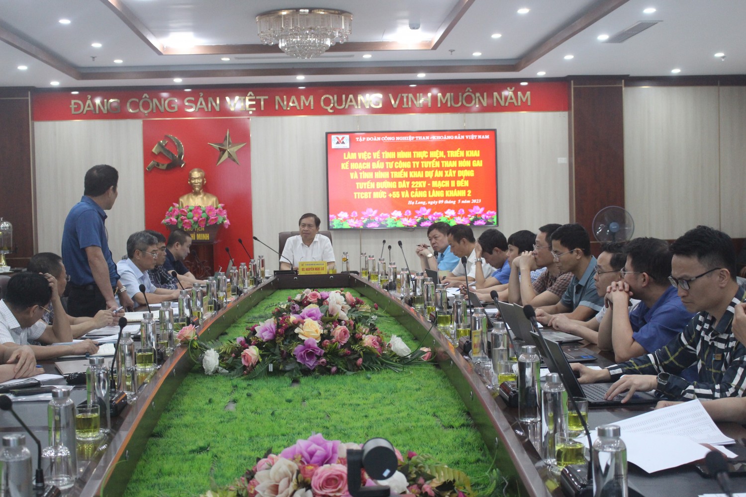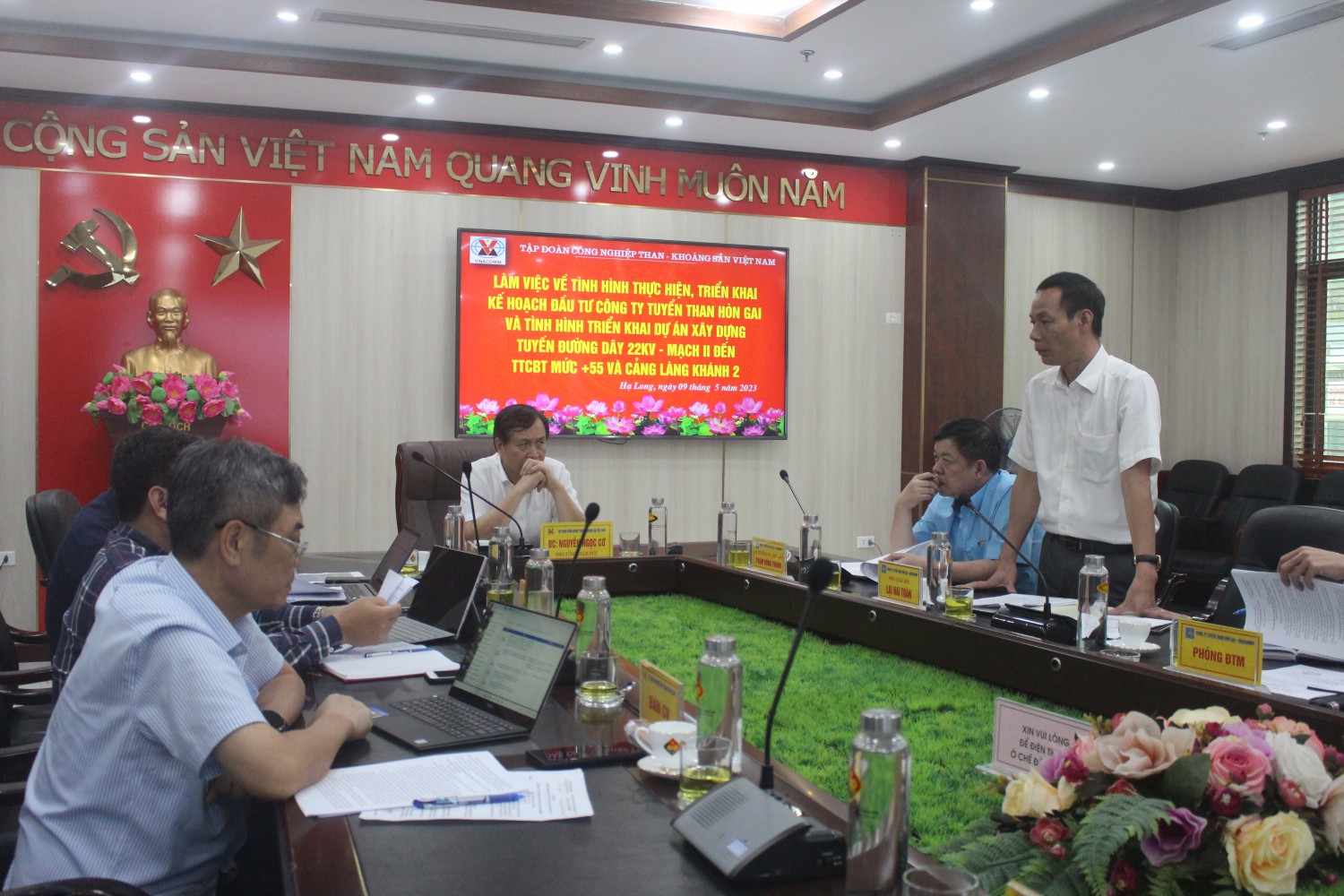 Tại buổi làm việc, sau khi nghe đồng chí Phạm Hồng Thanh - Bí thư Đảng ủy, Giám đốc Công ty Tuyển than Hòn Gai - Vinacomin đã báo cáo về việc để chuẩn bị thực hiện dự án nâng cao năng lực tiêu thụ than tại khu vực Cảng Làng khánh và thực hiện các dự án, công trình trong KHĐT năm 2023; đồng thời triển khai dự án xây dựng tuyến đường dây điện 22kV mạch II đến Trung tâm chế biến than mức +55 và Cảng Làng khánh 2 (Công ty than Hòn Gai); Các ý kiến của đại diện ban lãnh đạo Công ty than Hòn Gai -TKV;Cán bộ các phòng kỹ thuật nghiệp vụ của Công ty và các Ban chuyên môn Tập đoàn đã đánh giá, phân tích điều kiện thực hiện cùng những thuận lợi, khó khăn trong quá trình triển khai dự án, công trình trong năm 2023.