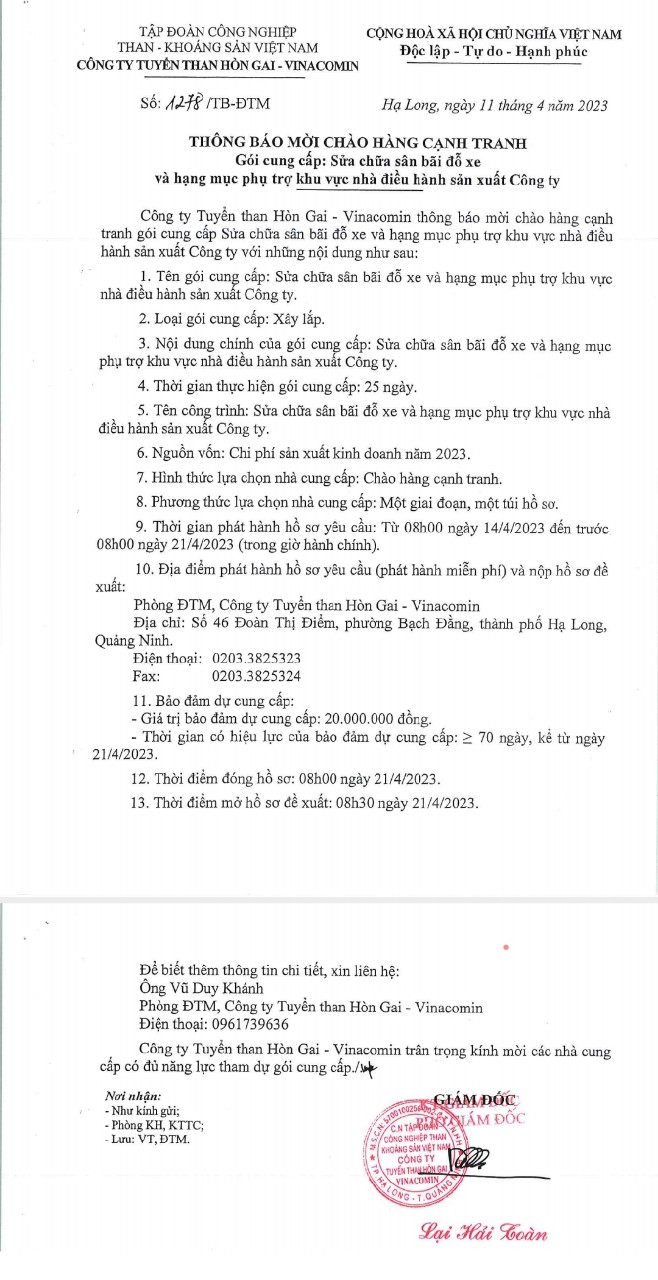 Thư mời chào hàng cạnh tranh gói cung cấp Sửa chữa sân bãi đỗ xe và hạng mục phụ trợ khu vực nhà điều hành sản xuất Công ty