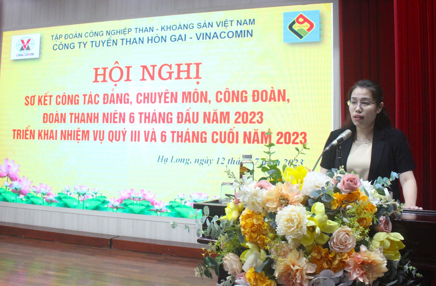 Phát biểu tại Hội nghị đồng chí Nguyễn Thị Thùy Linh - UVBCH Đảng bộ Tập đoàn TKV, Phó trưởng ban Tuyên giáo, Truyền thông, Quan hệ cộng đồng đã chia sẻ và thông báo một số các chủ trương, kế hoạch của Đảng ủy TKV, đồng thời chúc mừng các thành tích đáng ghi nhận của tập thể cán bộ, đảng viên, CNV Công ty trong thời gian qua đã rất cố gắng hoàn thành tốt các nhiệm vụ được giao. Trong thời gian tới, Công ty cần tiếp tục triển khai các nội dung trọng tâm của hội nghị Trung ương VII khóa XIII; Phấn đấu thắng lợi hoạt động chính trị của Công ty nói riêng và Tập đoàn nói chung bằng những hình thức tuyên truyền phong phú, thiết thực và hiệu quả; Hướng ứng và triển khai giải Búa liềm vàng năm 2023 của Đảng bộ khối Doanh nghiệp Trung ương; Tập trung tuyên truyền sâu rộng các ngày lễ lớn của đất nước, của Tập đoàn. Thay mặt Lãnh đạo Công ty đồng chí Phạm Hồng Thanh - Bí thư Đảng uỷ, Giám đốc Công ty đã bày tỏ sự quan tâm chỉ đạo rất sát sao của Đảng ủy Tập đoàn TKV và biểu dương, ghi nhận những kết quả đã đạt được của các tổ chức chính trị, cán bộ, đảng viên, người lao động trong Công ty đã rất cố gắng đẩy mạnh phong trào thi đua lao động sản xuất góp phần cùng Đảng bộ Công ty thực hiện thắng lợi nhiệm vụ quý II, 06 tháng đầu năm 2023. Đồng chí cũng đánh giá cao ý kiến tham luận của đại diện Phòng ĐTM và Phân xưởng Kho cảng Làng khánh 2 về những lĩnh vực quan trọng trong thực hiện nhiệm vụ cấp bách của Công ty hiện nay. Hội nghị Công ty cũng đã tuyên dương khen thưởng, trao tặng Bằng khen, danh hiệu chiến sỹ thi đua của Chủ tịch ủy ban quản lý vốn nhà nước; Bằng khen của Tổng Giám đốc TKV; Giấy khen của Giám đốc và của Công đoàn Công ty cho các tập thể, cá nhân đạt có thành tích xuất sắc trong công tác Đảng, công tác SXKD, công tác Công đoàn và trao tặng phần thưởng cho 10 đồng chí là CBCNV tiêu biểu trong lao động sản xuất (Tốp 10) quý 2/2023.