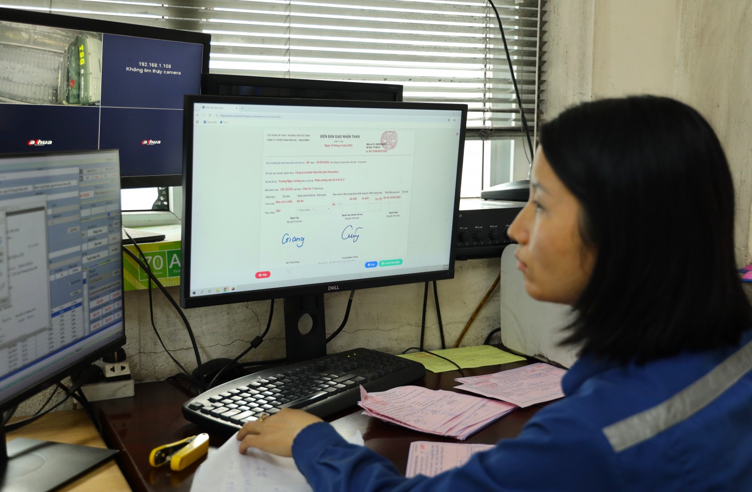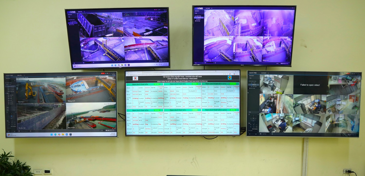 Tại phòng giám sát tập trung, hệ thống máy tính kết nối với các màn hình lớn hiển thị trực quan toàn bộ dữ liệu và hình ảnh từ các trạm cân, cho phép cán bộ giám sát dễ dàng theo dõi, điều hành và xử lý tình huống phát sinh. Việc tập trung đầu mối giám sát không chỉ nâng cao hiệu quả quản lý mà còn giúp tăng tính bao quát, minh bạch trong toàn bộ quá trình giao nhận than.