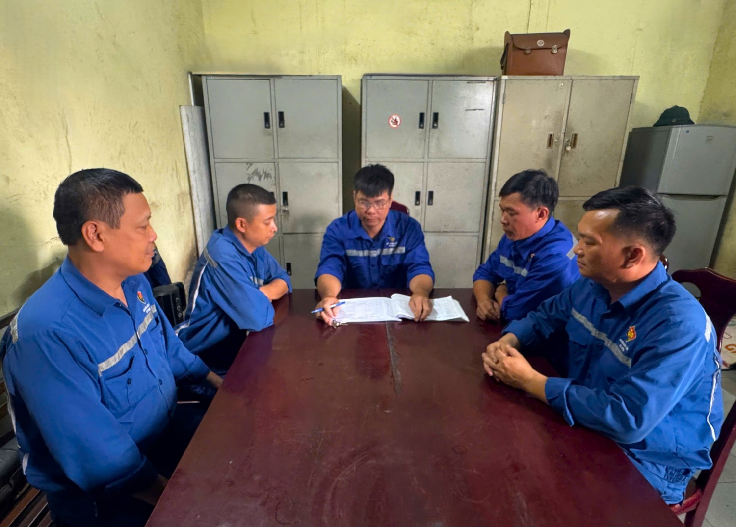 Anh Lê Văn Bẩy trao đổi, phân công nhiệm vụ cho công nhân trong ca sản xuất.