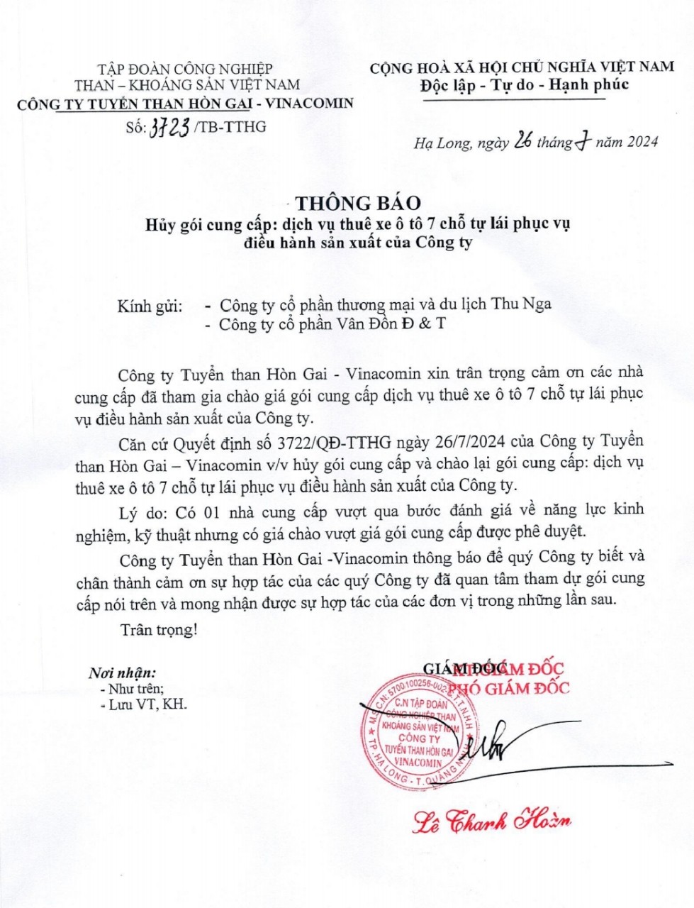 Thông báo V/v: Hủy gói cung cấp dịch vụ thuê xe ô tô 7 chỗ tự lái phục vụ điều hành sản xuất của Công ty