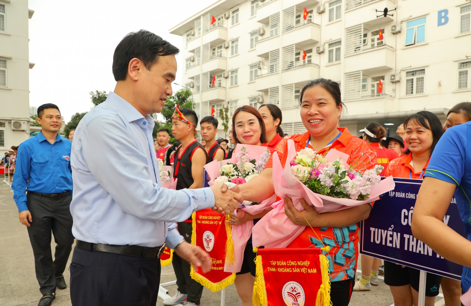 Đồng chí Lê Thanh Xuân - Chủ tịch Công đoàn TKV tặng hoa và cờ lưu niệm cho đội Công ty Tuyển than Hòn Gai