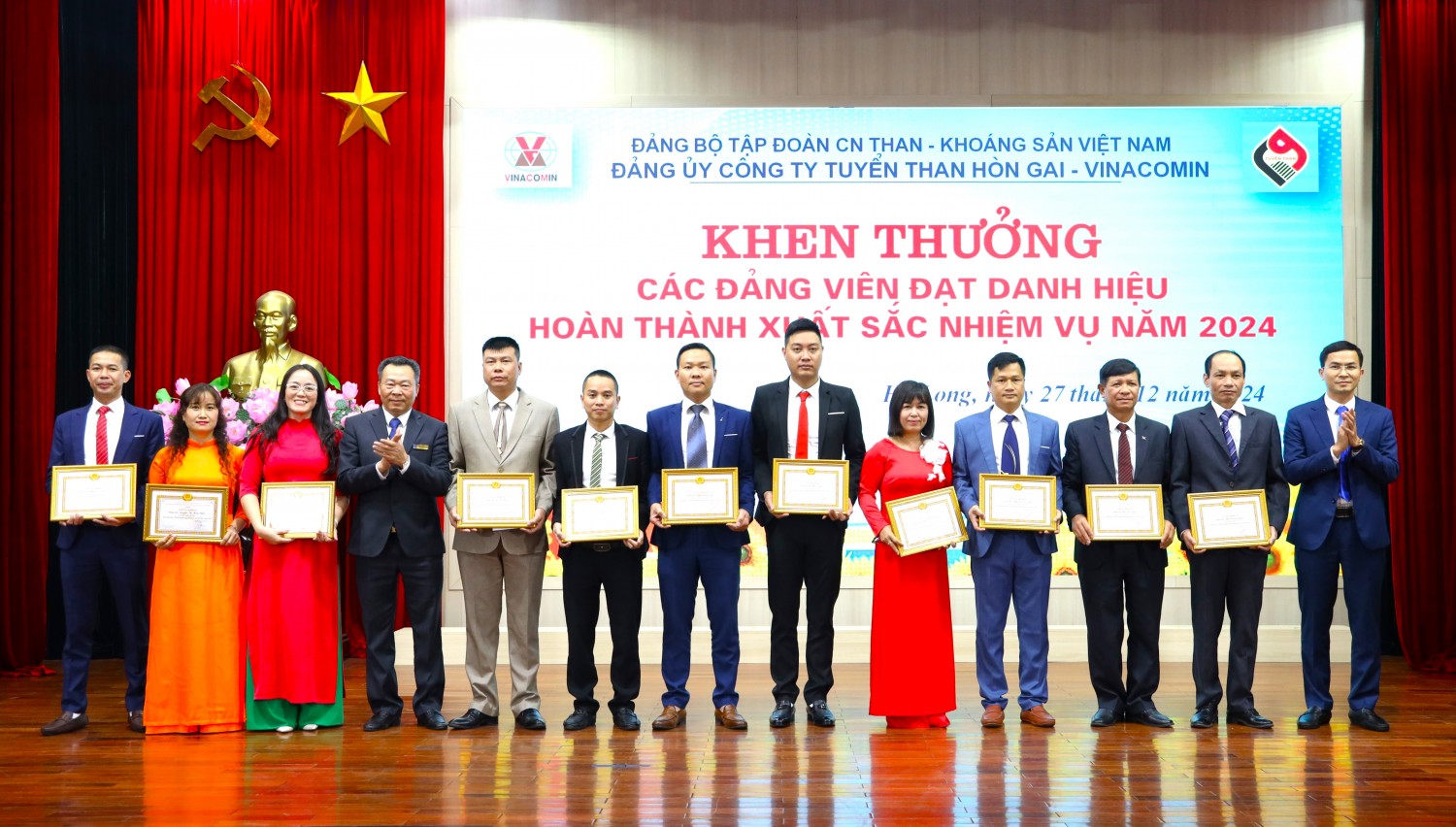 Anh Lê Văn Bẩy (người đứng thứ năm bên trái) nhận Giấy khen đảng viên hoàn thành xuất sắc nhiệm vụ năm 2024